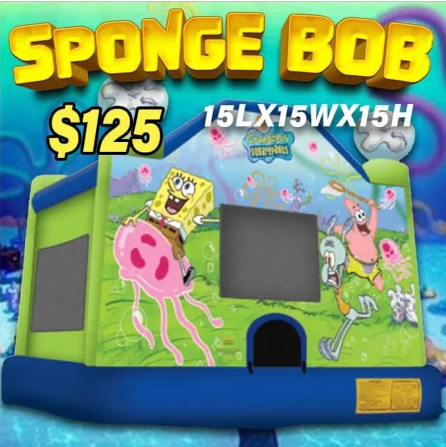 Bring the underwater fun of bikini bottom to your next event with our SpongeBob bounce house this lively inflatable features bright blue and green colors that immediately catch the eye and create a cheerful playful atmosphere for kids. on the front a vibrant image of SpongeBob SquarePants welcomes young jumpers while Patrick and Squidward other familiar characters appear in the background bringing the whimsical world of bikini bottom to life. inside kids can bounce jump and play to their hearts content imagining themselves alongside their favorite Nickelodeon friend the spacious jumping area provides plenty of room for energetic fun while the colorful design sparks creativity and makes every celebration feel extra special perfect for birthday parties school events backyard gatherings or any kid focus celebration the SpongeBob moon bounces is sure to be a hit with its fun and design and beloved characters it delivers hours of safety safe imaginative and non-stop entertainment bringing smiles to feds of all ages