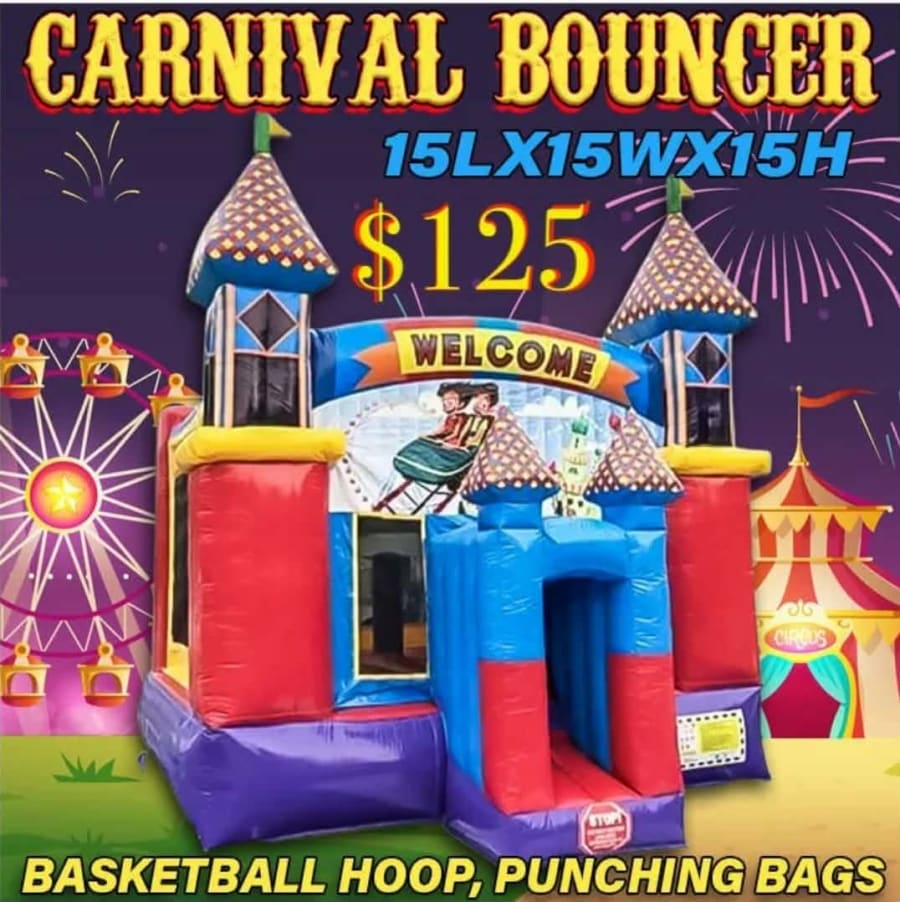 Bring the excitement of the fair to your next event with our carnival bounce a colorful and action packed inflatable design for endless fun this castle themed moon bounce features bold purple red blue and yellow colors that instantly capture attention and create a festive carnival like atmosphere. inside kids can jump and play in a spacious bouncing area challenge themselves with the built-in basketball hope or navigate the interactive punching bags for extra excitement the whimsical castle design adds a playful touch sparking imagination as children bounce climb and explore perfect for birthday parties school events community gatherings or backyard celebration the carnival bouts provides hours of safe energetic fun its bright colors engaging theme and activity packed interior make it a crowd favorite for the centerpiece of any of it turn your party into a fairground of fun with the vibrant and entertaining carnival bounce