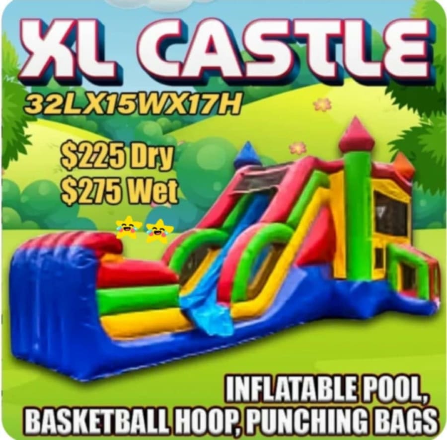 Turn your next event into an action-packed adventure with the XL Castle Combo, the perfect bounce house and slide combo for kids who love not stop excitement! This colorful, castle-themed inflatable brings larger than life fun with multiple activities designed to keep children entertained for hours. With its bright red, green, yellow, and blue designed, it instantly grabs attention and becomes the centerpiece of any party. Kids could jump in the spacious play area shoot hoops with the built-in basketball hoop, weave through the punching bags, had climbed their way up to the top of the dual- slide for even more fun, add water for the refreshing splashed down into the inflatable pool, or keep it dry for year round sliding the excitement. Whether used wet or dry the XL Castle combo delivers a thrilling experience suitable for a wide range of ages. mesh windows around the bounce area offer great air flow and clear visibility allowing parents to easily supervise the fun. The safe, cushioned entrance insurance comfortable access for children, making it perfect for birthday parties, school events, family gatherings, community celebrations, and more. Durable, vibrant, and packed with engaging features, the Xl Castle Combo is built to make your every event unforgettable. Bring on the laughter,Energy, and endless play this inflatable has it all!