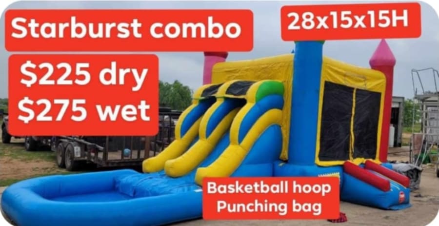 Bring vibrant excitement to any event with our starburst Cabo a colorful and action packed Inflatable designed to keep kids entertained for hours featuring a bright mix of blue yellow red pink and green this moon bounce instantly stands out and adds a fun festive vibe to any celebration. kids can enjoy a spacious bouncy area equipped with basketball hoop for friendly competitions and an interactive punching bag that adds extra excitement inside the unit the two lane slide takes the front to the next level allowing two riders at once perfect for keeping lights moving and giving kids double the thrill this versatile combo can be enjoyed wet or dry making it ideal for year round use keep it dry for everyday bouncy and sliding fun or add water to turn the slide into a refreshing splash adventure on hot days the best that windows provides excellent air flow at clear visibility making it easy for parents to supervise while kids play safely perfect for birthday parties school events community gatherings or backyard celebrations the starburst cobble brings energy color and nonstop flood to every occasion inflatable is sure to be the highlight of your event